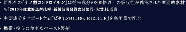 • 新配合の「ナノ型コンドロイチン」は従来成分の300倍以上の吸収性が確認された画期的素材